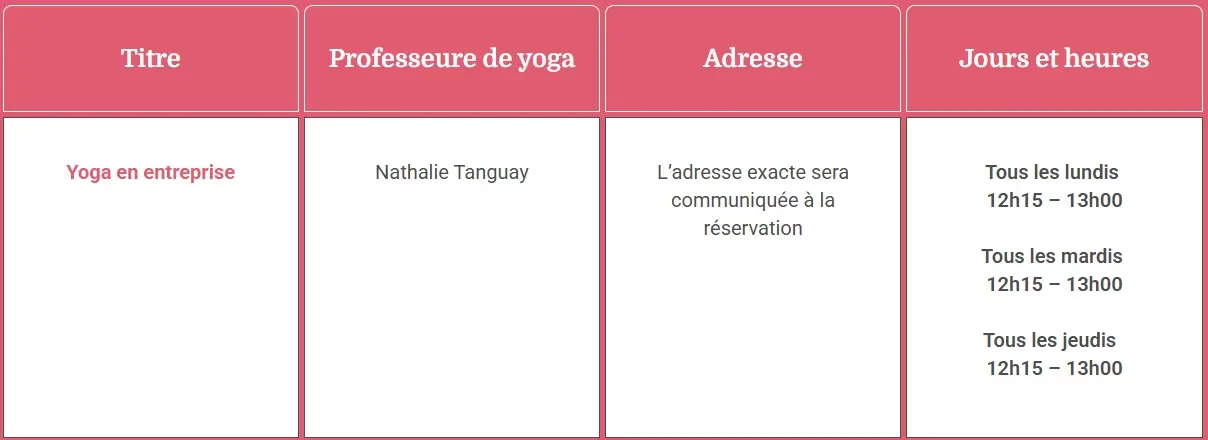 « C’était ma toute première expérience de yoga, et j’ai été agréablement surprise par tout ce que ce cours m’a apporté. J’ai vraiment apprécié la bienveillance et la douceur de Nathalie, qui a su créer un espace accueillant et rassurant. Elle était à l’écoute de nos besoins, très compétente, et a su adapter le cours à notre niveau. Merci pour ce beau moment de détente et de découverte ! »